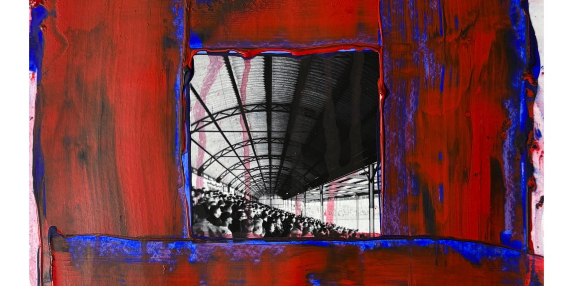 These mainly red and blue pieces can be read as explicit nods to Aldershot Town FC — the club’s red & blue identity is civic shorthand in this town. In small, focused works, these colours become shorthand for crowd, passion and local loyalty without becoming illustration. While not trying to avoid football iconography my use of palette and surface (rips, paint splashes), results in a more emotional shorthand than fandom merch.
